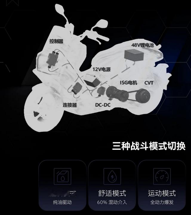 动力部分,机甲蜂150一共有两个版本,燃油版售价12970元、混动版售价15970元。这里重点说一下48V轻混+ISG电机版本,该版本共有3种驾驶模式(燃油模式、舒适模式、运动模式)。据笔者了解已经有好几家摩企开始尝试混动(大阳、春风、无极、猎变等),也许未来会大面积上混动车(不限号???)。主动力为150cc级别单缸水冷发动机,最大功率11.8kW、最大扭矩14.7N・m;配合轻混,实测油耗仅有2.32L/100km,极速110km/h。