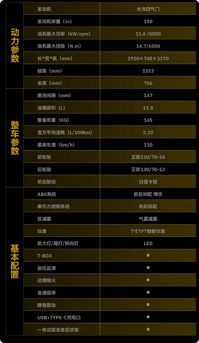 续航部分,不过考虑个人驾驶情况不同,油耗表现可能会有轻微上浮,但该车拥有11.8升的大油箱,满油跑400km还是没有压力的。既然是未来机甲科技的定位,配置上机甲蜂150也十分不俗。该车配备了无钥匙启动系统、7寸TFT全彩仪表(胎压检测、T-BOX定位、手机互联等);还有静音启动、怠速启停等配置,大大提升了日常骑行舒适性。